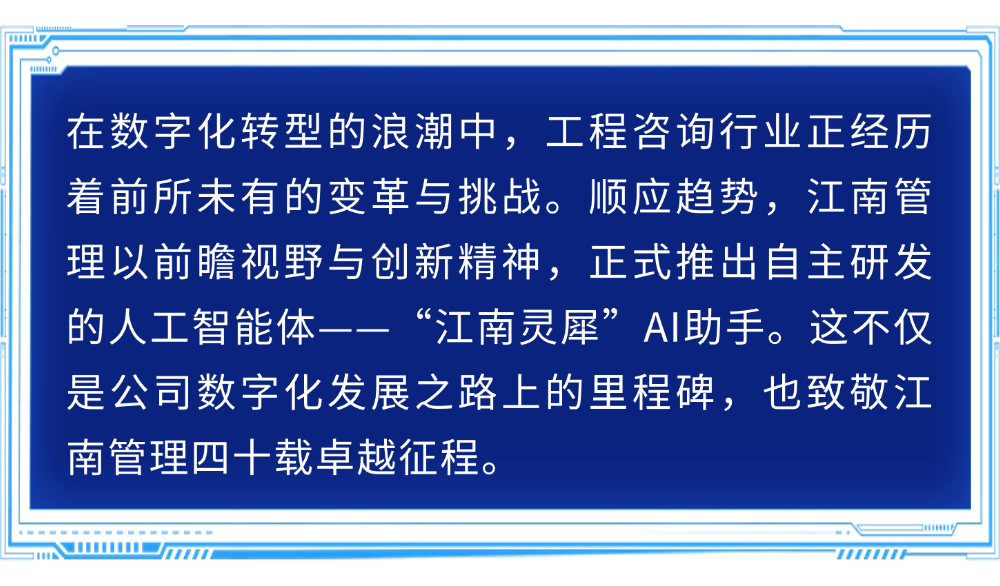 未來,江南管理將繼續(xù)依托即將推出的“江南靈犀”平臺,把人工智能技術融入全過程工程咨詢業(yè)務鏈條,打造智慧化、高效化的服務平臺,探索前沿科技在工程咨詢領域的更多可能,為客戶創(chuàng)造更大的價值。