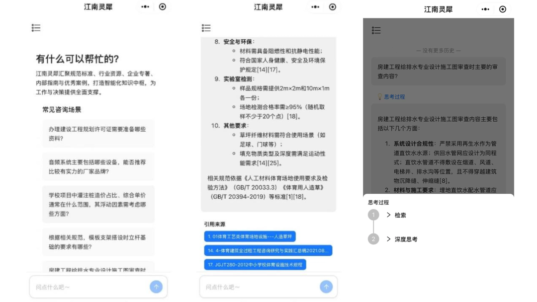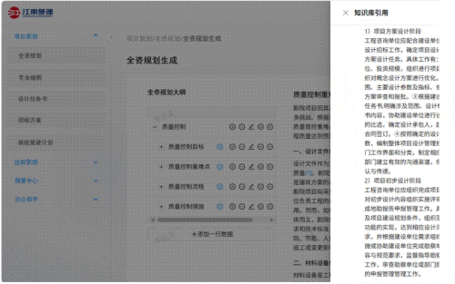 “江南靈犀”AI助手從全過程咨詢服務成果入手,將逐步覆蓋項目策劃、規(guī)劃、設計、招采、施工到運維各個階段,從客戶需求出發(fā),通過問答式、診斷式互動提供幫助。無論是復雜項目的過程管理,還是精細化的成本控制,“江南靈犀”都將結合企業(yè)大量的歷史數(shù)據知識積累,科學智能地賦能前端,提升工作效率和服務質量。